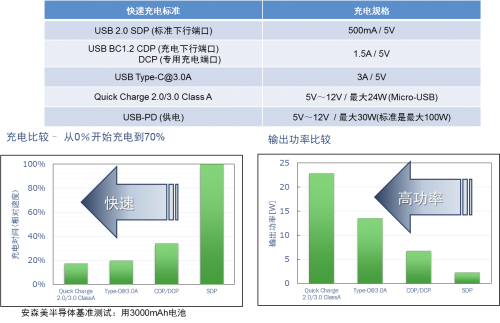 為加快充電速度,縮短充電時(shí)間,市場(chǎng)上產(chǎn)生了各種快速充電標(biāo)準(zhǔn),其規(guī)格和充電速度及輸出功率如圖4所示。一般而言,輸出電流和輸出電壓越高,充電越快。安森美半導(dǎo)體的移動(dòng)電源方案LC709501可自動(dòng)檢測(cè)移動(dòng)設(shè)備的電池標(biāo)準(zhǔn),并集成最佳充電方式選擇功能,通過(guò)更新固件支持最新的快速充電標(biāo)準(zhǔn),如高通快速充電QC2.0和QC3.0等專有充電協(xié)議,并可通過(guò)額外的軟件支持USB PD和Type-C連接,資深用戶甚至可對(duì)LC709501F重新編程以實(shí)現(xiàn)定制的充/放電協(xié)議,通過(guò)改變外部MOSFET支持最大12V、2.5A(30W)的輸出功率等級(jí)。