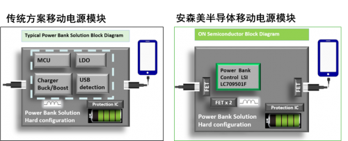 圖3:移動(dòng)電源之傳統(tǒng)方案架構(gòu)對(duì)比安森美半導(dǎo)體方案架構(gòu)