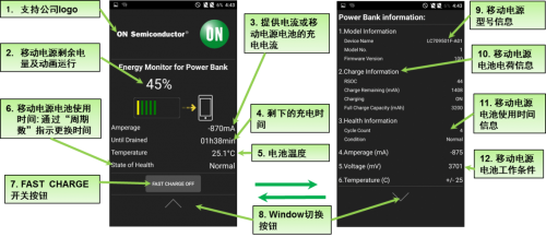 如圖2所示,只要基于LC709501的移動(dòng)電源被連接到移動(dòng)設(shè)備如智能手機(jī),創(chuàng)新的移動(dòng)電源應(yīng)用程序就自動(dòng)啟動(dòng),移動(dòng)電源的詳細(xì)運(yùn)行信息及關(guān)鍵參數(shù)將顯示在智能手機(jī)的屏幕,如移動(dòng)電源電池剩余電量及動(dòng)畫運(yùn)行、移動(dòng)電源電池使用時(shí)間、剩下的充電時(shí)間、電池溫度、快充開(kāi)關(guān)按鈕等等,并且該方案還支持移動(dòng)電源供應(yīng)商在該App界面顯示其公司Logo。