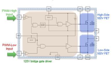 FDMF8811集成了一對100V的功率MOSFET、120 V驅動器IC和一個自舉二極管到6.0 mm x 7.5 mm 的PQFN封裝。
