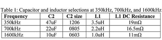 表格1:頻率分別為350kHz, 700kHz,和1600 kHz時的電容器和感應(yīng)器選項 |
