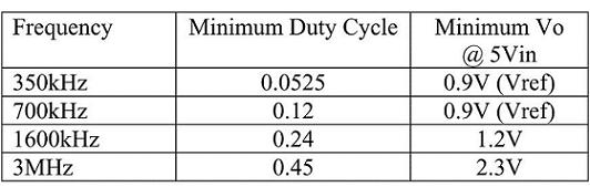 上面例子中的TPS54317型轉(zhuǎn)換器任務(wù)周期為0.36 (1.8V/5.0V),最小啟動時間為數(shù)據(jù)表中所示的150ns(最大值)。可控制脈寬的限制產(chǎn)生了可獲得的最小任務(wù)周期,根據(jù)等式3可以很容易算出來。一旦知道了最小任務(wù)周期,就可以計算出最低可獲取輸出電壓,如等式4和表格2中所示。最低輸出電壓也受到轉(zhuǎn)換器參考電壓限制,TPS54317的最低輸出電壓為0.9V。