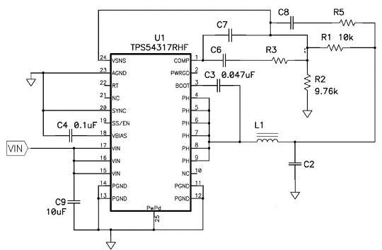 最低輸出電壓=輸入電壓x 最小任務(wù)周期(受TPS54317參考電壓限制)