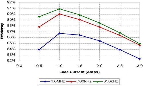 我們來對比一下這三種頻率分別為的350, 700和1600 kHz的電源的利弊。三種方案都使用頻率1.6 MHz、低電壓、帶MOSFET的TPS54317型3 A同步降壓DC/DC轉(zhuǎn)換器作為調(diào)壓器。