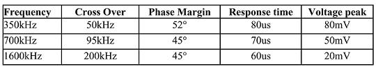 交越頻率大約是轉(zhuǎn)換頻率的1/8。當(dāng)使用一個快速轉(zhuǎn)換的DC/DC轉(zhuǎn)換器時,要確保電源IC誤差放大器有足夠的帶寬來支持一個高交越頻率。TPS54317的誤差放大器單位增益帶寬一般是5MHz。表格4顯示了實際瞬間反應(yīng)次數(shù)和相關(guān)電壓峰值過沖值。