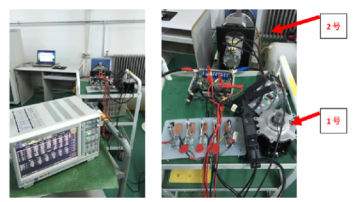 此次測試的對象為小型電機系統(tǒng),系統(tǒng)分為驅(qū)動器、電機平臺、測試,3個部分。驅(qū)動器輸出通過電纜連接到電機平臺,電機轉(zhuǎn)軸上安裝扭矩傳感器,傳感器所有連接線引到測試儀器,傳感器輸出信號接入功率分析儀電機測量單元扭矩BNC接口。傳感器輸出100kHz±50kHz脈沖對應(yīng)0±5Nm扭矩。