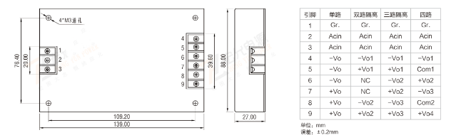 典型性能:金屬殼、寬壓輸入、單、雙、三路輸出,輸出低紋波噪聲、高穩壓精度、長期短路保護自恢復、過溫保護、過流保護、過壓保護、使用效率高,高隔離耐壓。